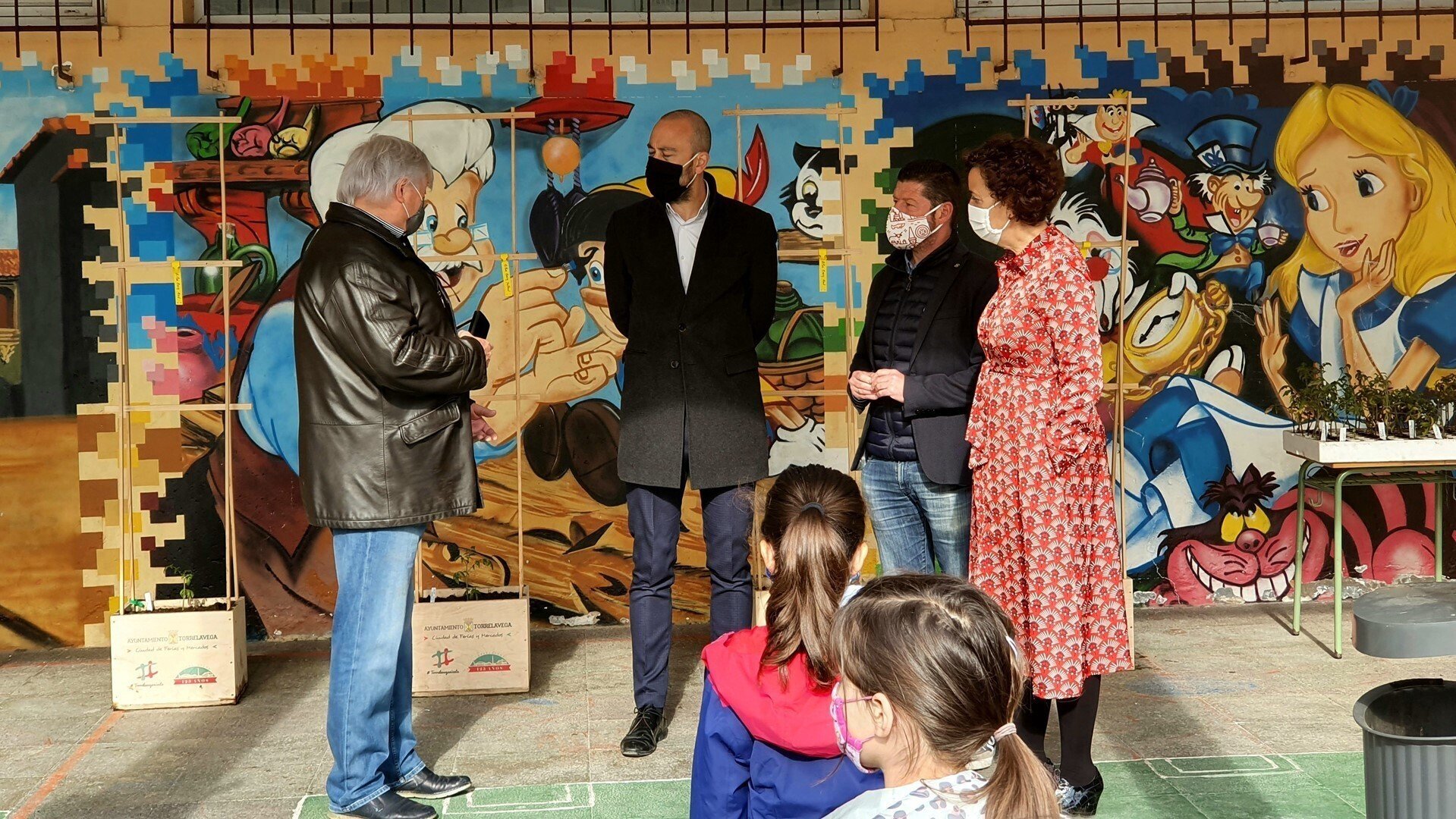El alcalde, Javier López Estrada, acompañado por el concejal de Ferias y Mercados, Jesús Sánchez, y representantes de estas asociaciones, ha entregado a los alumnos del colegio Menéndez Pidal del Barrio Covadonga varias plantas de tomate para que sean ellos quienes, a partir de ahora, se encarguen de su cuidado.