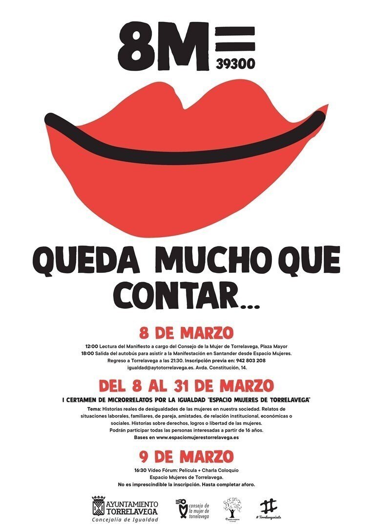 Con el lema 'Queda mucho que contar...' el programa incluye también la lectura de un manifiesto, como viene siendo habitual cada 8M, a las 12 horas en la Plaza Mayor, a cargo del Consejo de la Mujer de Torrelavega.