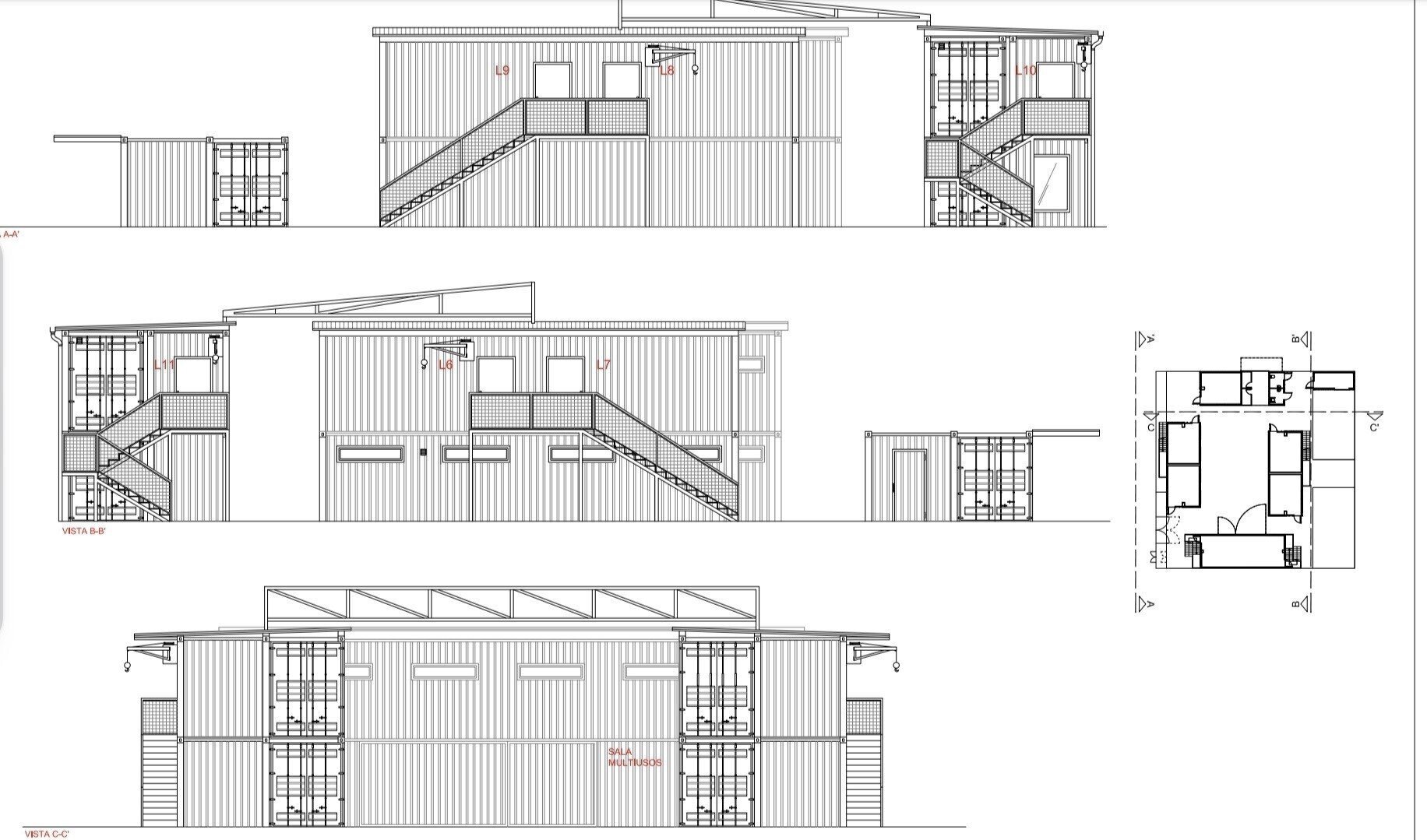 Para el acceso a estos nuevos locales se han diseñado escaleras de estructura metálica y se colocarán puertas acústicas anulando las puertas de carga con las que cuentan los contenedores por el interior, quedando solo a efectos decorativos.
