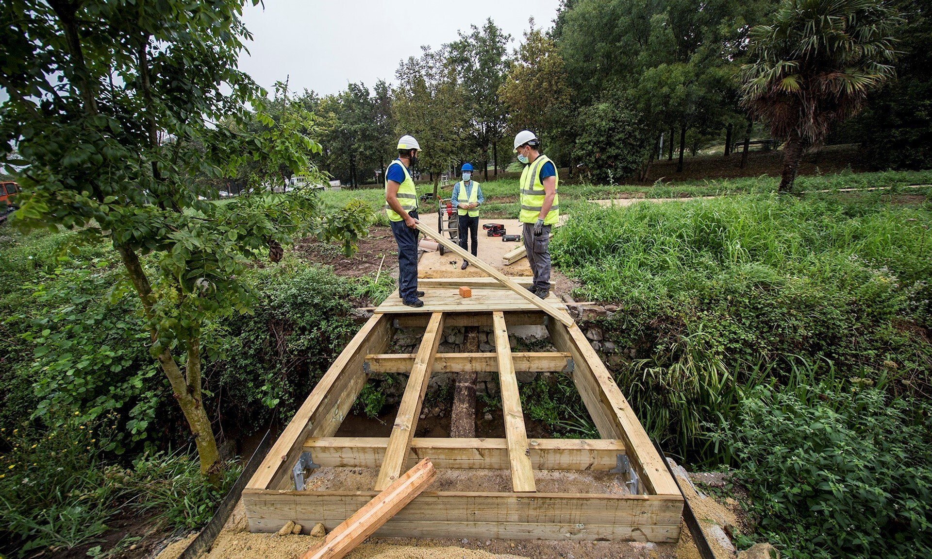 Según ha informado el Consistorio en nota de prensa, esta zona contaba con un pequeño paso de hormigón que carecía de barandillas, y esta pasarela de madera en el mismo lugar se integra mejor dentro de este espacio verde que se espera poder abrir al público este mes de septiembre.