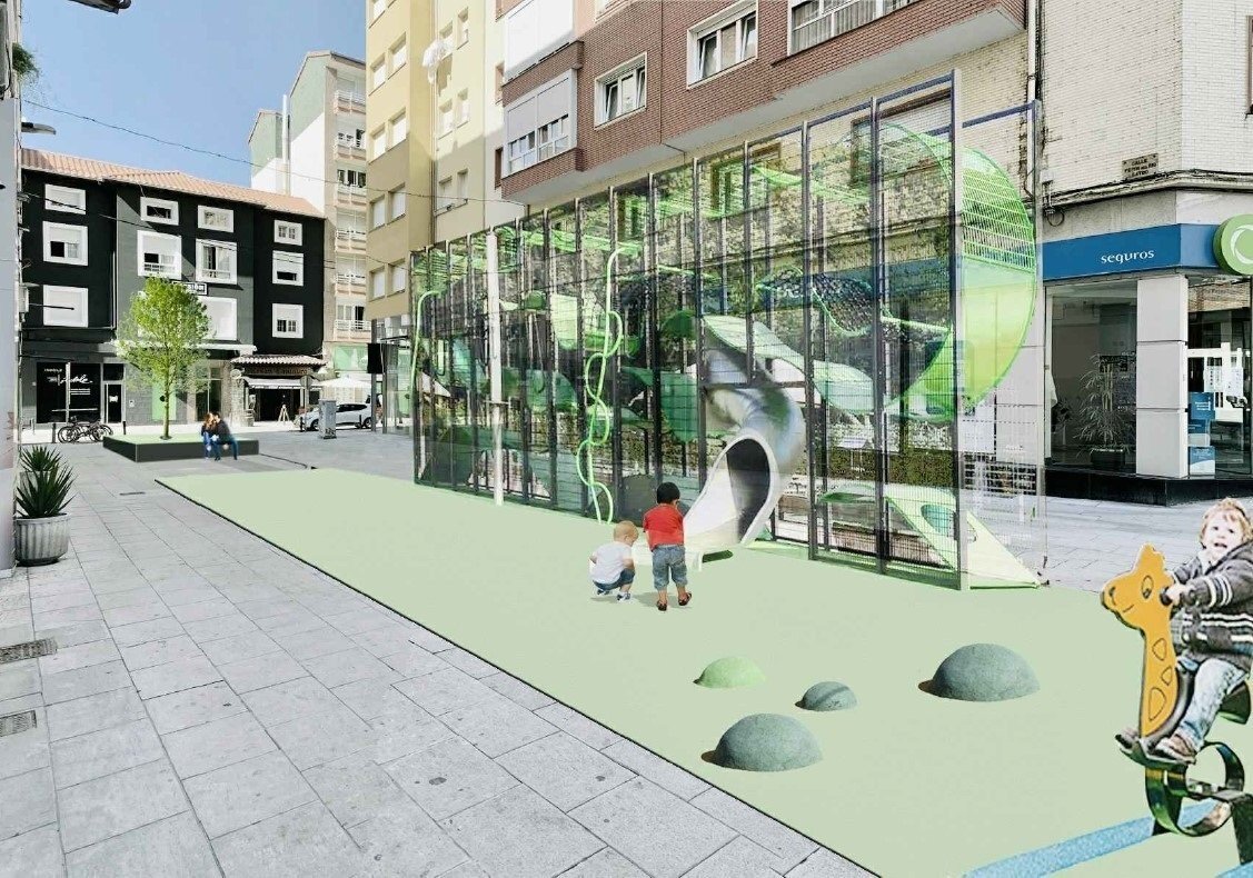 Solamente se actuará linealmente en la zona central, con un elemento de juego novedoso en la ciudad, diseñado para jugar en su interior, translúcido y al que se podrá acceder únicamente desde uno de los lados de la calle.