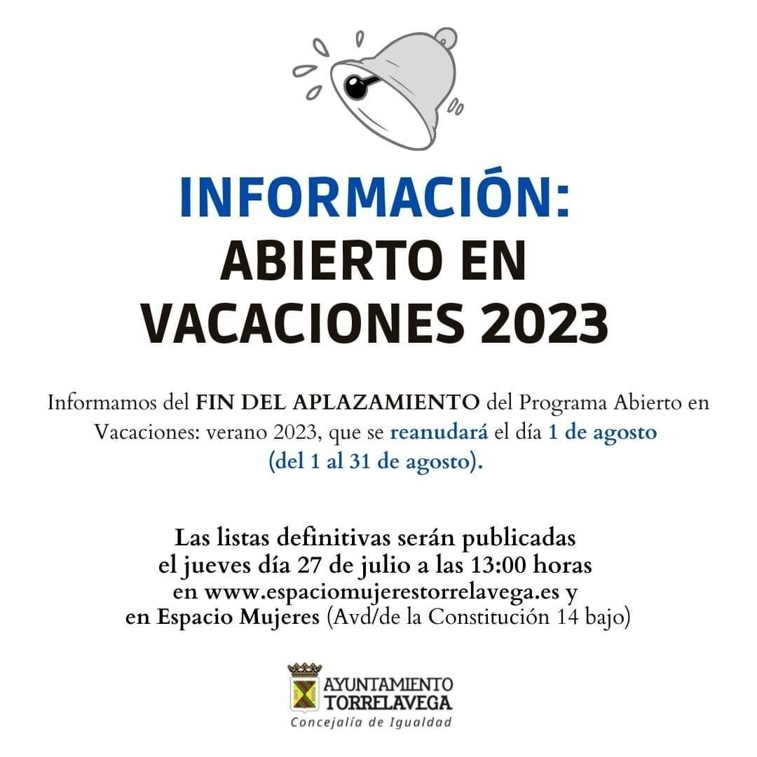 El Ayuntamiento de Torrelavega reanudará el 1 de agosto el programa de conciliación familiar y laboral 'Abierto en Vacaciones. Verano 2023', que estaba previsto desarrollarse durante la segunda quincena de julio pero tuvo que aplazarse por circunstancias administrativas en el procedimiento de contratación.
