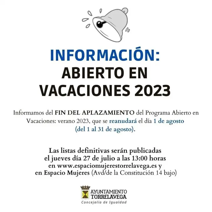 El Ayuntamiento de Torrelavega reanuda este martes, el 1 de agosto, el programa de conciliación familiar y laboral 'Abierto en Vacaciones. Verano 2023', que estaba previsto desarrollar durante la segunda quincena de julio pero tuvo que aplazarse por circunstancias administrativas en el procedimiento de contratación.