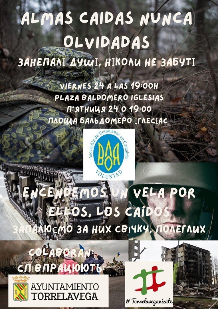 El Ayuntamiento de Torrelavega y la Asociación de Ucranianos de Cantabria han organizado un acto homenaje al pueblo ucraniano que se celebrará este viernes 24, a las 19.00 horas, en la Plaza Baldomero Iglesias, con el lema 'Almas caídas nunca olvidadas'.