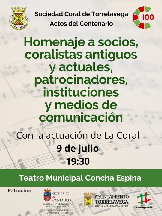 Igualmente a la Junta Directiva actual, que ha guiado a la Sociedad con visión y entrega, así como a los miembros de antiguas juntas directivas. Los socios de la Coral que han sido siempre sostén y aliento constante, asistiendo a los conciertos y participando con entusiasmo en cada actividad. Se reconocerá también el apoyo de las instituciones locales y regionales, que han acompañado a la Coral en este siglo de historia, contribuyendo al enriquecimiento cultural de Torrelavega. A los patrocinadores del Centenario, quienes han hecho posible que cada acto se celebre con dignidad y calidez, y a los medios de comunicación, que con su cobertura y cercanía han ayudado a difundir nuestra historia, manteniendo viva la llama coral en cada hogar.