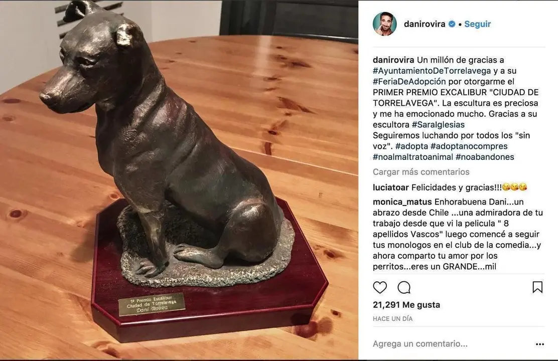 Dani Rovira agradecía en la jornada de ayer a través de su instagram (con más de 1 millón de seguidores) que se le otorgara el primer premio Excalibur Ciudad de Torrelavega en la Feria de Adopción celebrada el pasado 17 de Diciembre en el Mercado Nacional de Ganados de la Capital del Besaya.