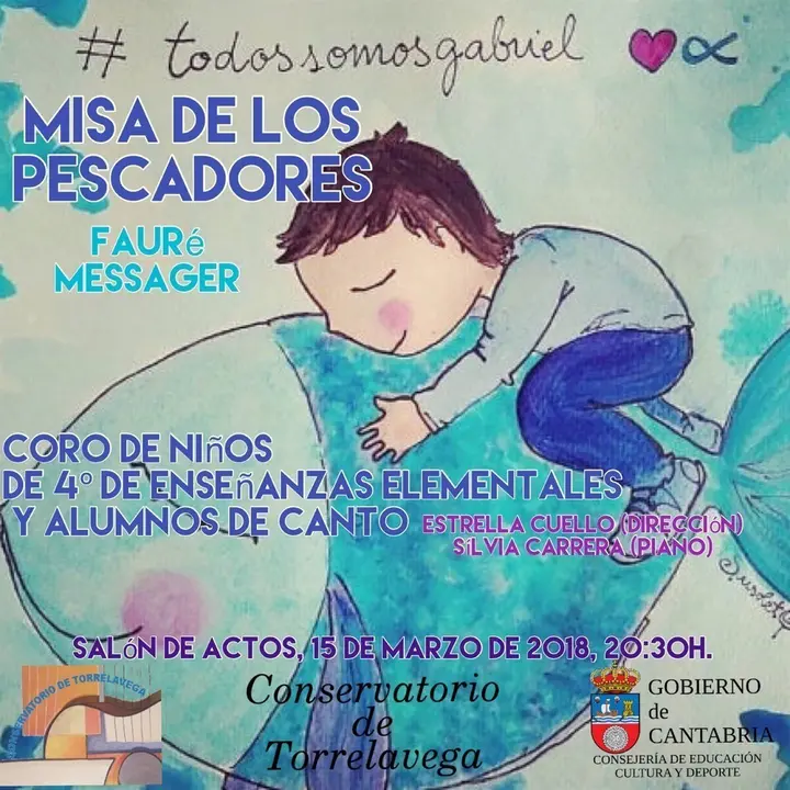 Alumnos del Conservatorio de Torrelavega, la mayoría pertenecientes al Coro de Voces Blancas, ofrecerán este jueves, 15 de marzo, un concierto en el que interpretarán la Misa de los Pescadores de Fauré y Messager, que dedicarán a la memoria de Gabriel Cruz, el niño de 8 años hallado muerto en Almería tras doce días de búsqueda desde su desaparición.