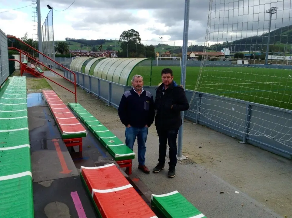 El concejal de Deportes, Jesús Sánchez, junto al presidente del Tropezón, Valentín Gutiérrez, ha visitado el campo 2 de Santa Ana para comprobar la instalación de estas dos "pequeñas gradas".