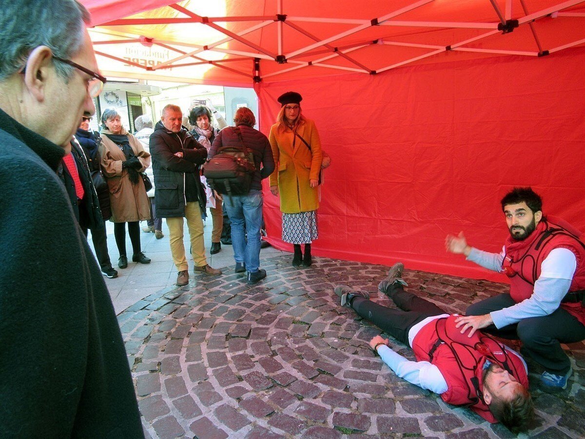 La campaña SOS RESPIRA de la Fundación Mafre y Facyre ha enseñado a actuar ante un caso de atragantamiento en adultos y niños mayores de un año mediante un simulacro que ha tenido lugar en una carpa situada en la Plazuela del Sol de Torrelavega.