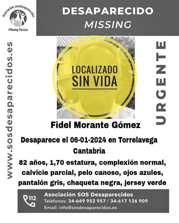 El hombre, Fidel Morante, de 82 años de edad, pareció haberse desorientado el pasado 6 de enero, día de Reyes. Desde entonces, estaba perdido en cualquier punto de la comarca del Besaya, vistiendo pantalón gris, chaqueta negra y un jersey verde, mide 1,70m y es de complexión normal, según la descripción aportada por la familia el día de la desaparición.