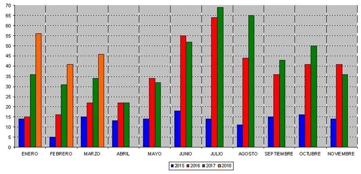 En este primer trimestre, se recibieron 56 avisos en enero, 41 en febrero y 46 en marzo, en comparación con los 36, 31 y 34 avisos de 2017, los 15, 16 y 22 avisos de 2016, o los 14, 5 y 15 avisos de 2015. Datos que demuestran "la consolidación y alto conocimiento ciudadano del servicio gratuito", ha insistido en edil.