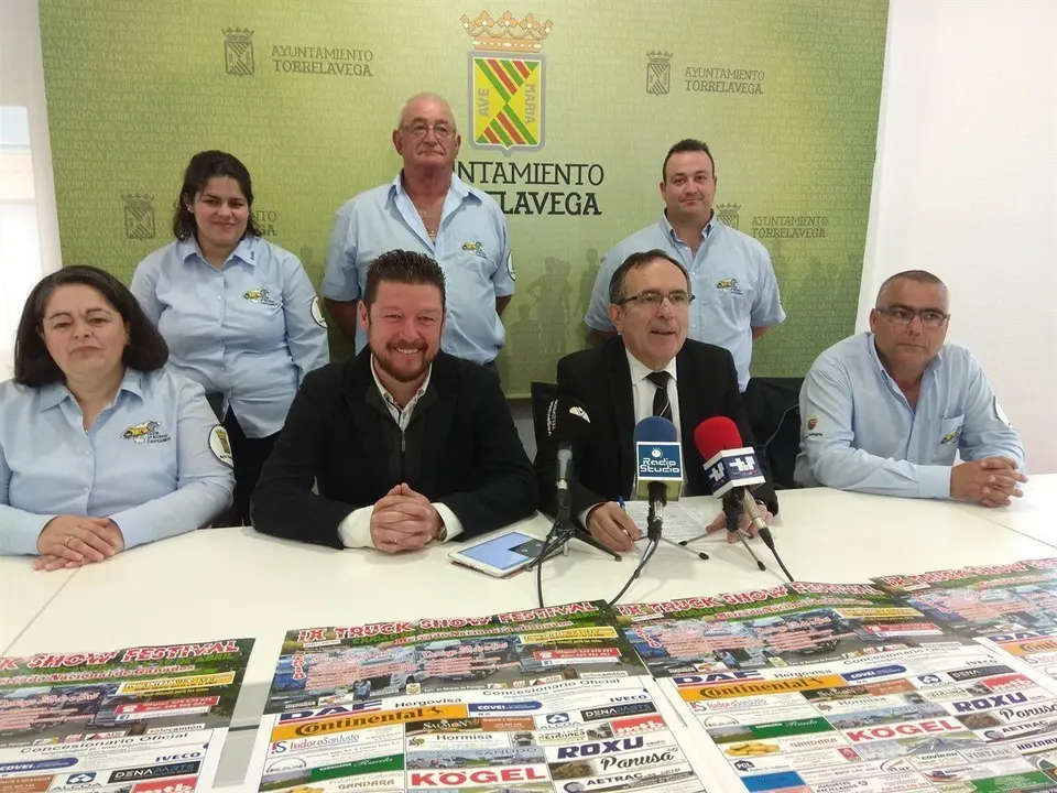 El alcalde de Torrelavega, José Manuel Cruz Viadero, acompañado por el concejal de Ferias, Jesús Sánchez, y el presidente del Club 5ª Rueda, Miguel Ángel Gutiérrez, ha presentado el IX Truck Show Festival que tendrá lugar en el exterior del MNG.