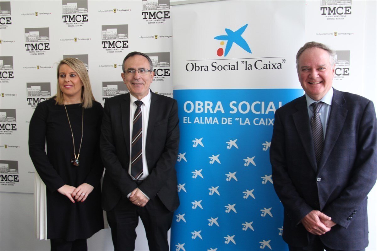 El alcalde de Torrelavega, José Manuel Cruz Viadero, y el responsable de Caixabank, César Gil, han presentado en el Teatro Municipal Concha Espina 'El Coleccionista de Paisajes', el espectáculo con el que la Obra Social 'La Caixa' colabora, como cada año, con el programa municipal.
