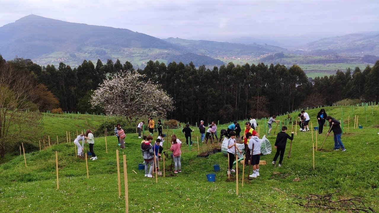 Cerca de 200 alumnos de Colindres pertenecientes a los cursos de sexto de Primaria y tercero de Secundaria han conmemorado el Día del Árbol (21 de marzo) con la reforestación de una parcela municipal.