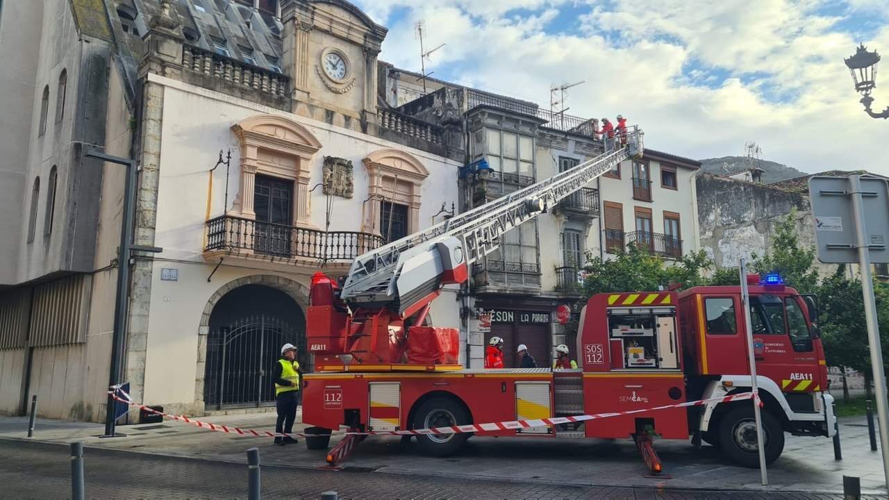 Bomberos del Gobierno de Cantabria han retirado esta tarde elementos de una fachada con riesgo de caída a la vía pública en Santoña.