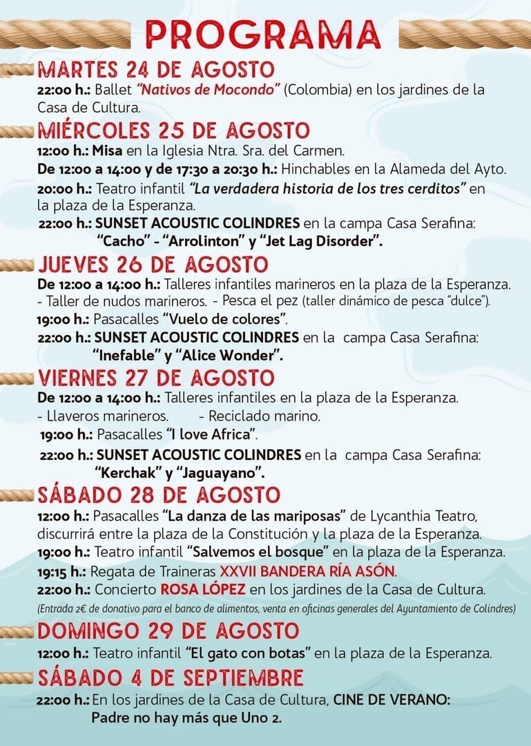 El sábado 28, además del concierto de Rosa López, que servirá para cerrar la jornada, está prevista la celebración de un nuevo pasacalles que, en este caso, discurrirá entre la plaza de La Constitución y la plaza de la Esperanza y que arrancará a medido día. Por la tarde tendrá lugar una nueva sesión de teatro infantil, seguida de la XXVII edición de la Regata de Traineras Bandera Ría Asón.