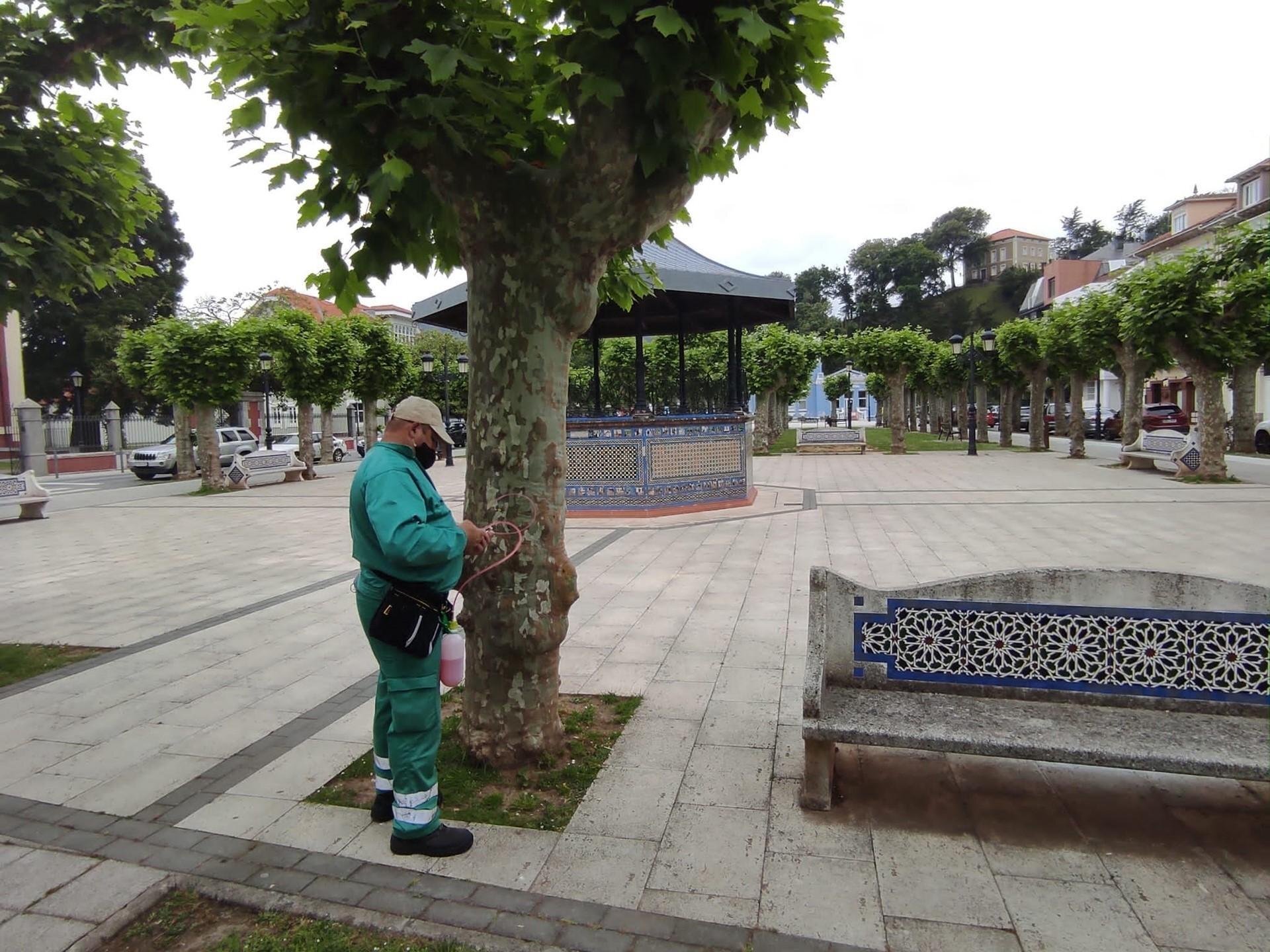 El Ayuntamiento de Colindres ha aplicado al arbolado de la Alameda un tratamiento de endoterapia vegetal con el fin de mantener la buena salud de los 130 ejemplares de plátanos de sombra (Platanus hispánica) que forman el conjunto.
