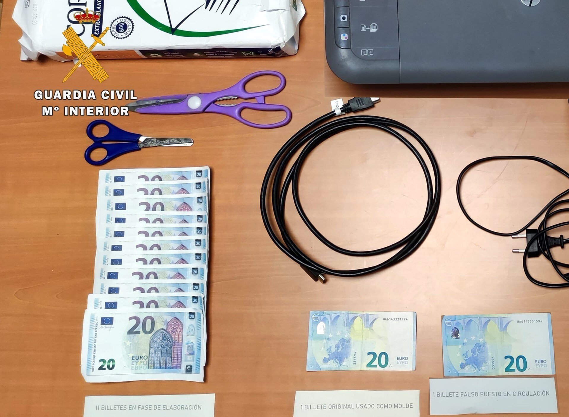 Finalmente, la Guardia Civil detuvo al hombre que pagó con el billete falso, portaba otros falsificados y tenía en su poder lo necesario para hacer nuevos billetes.