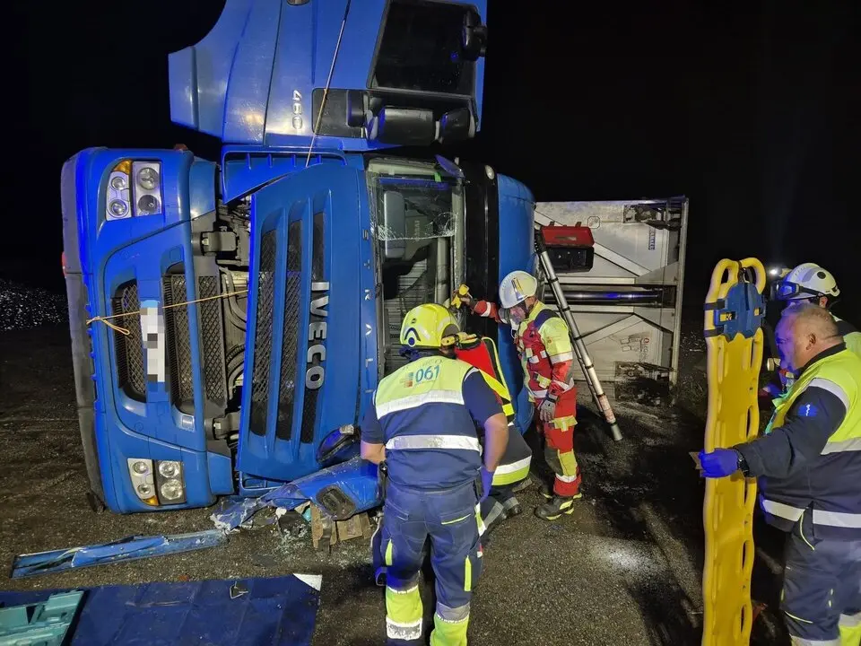 El accidente tuvo lugar anoche en el punto kilométrico 189 y los bomberos tuvieron que cortar los pilares de la cabina para poder liberar al conductor y ayudar al equipo sanitario a transportarle a la camilla.