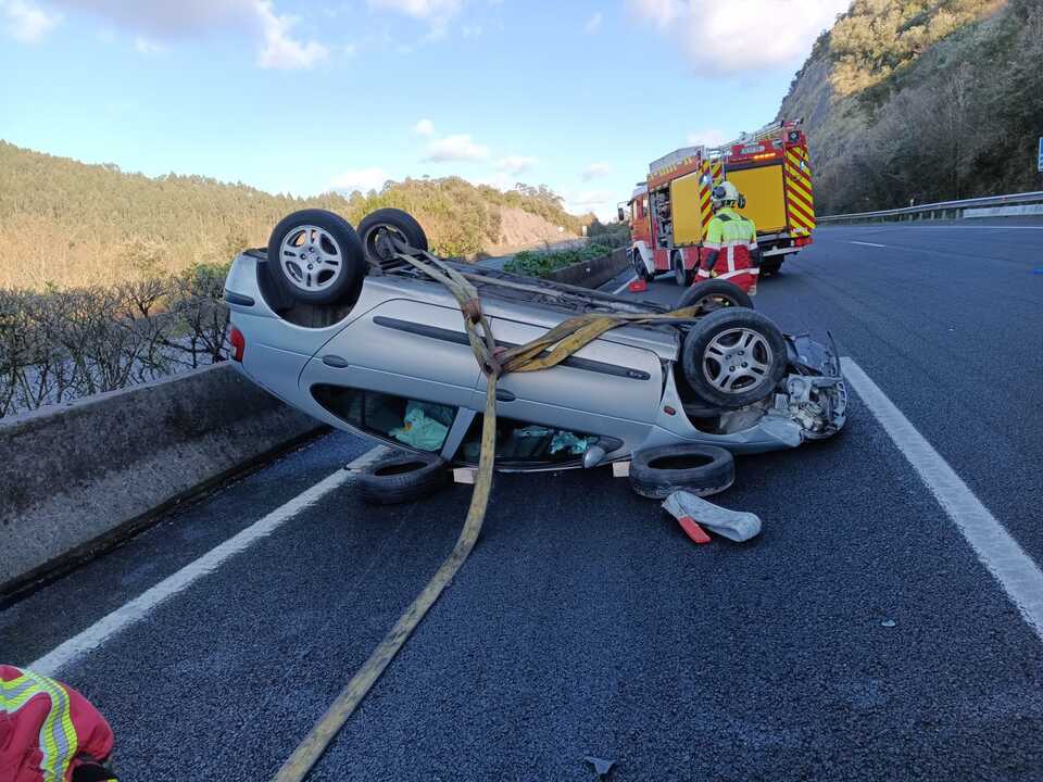 Al lugar del accidente se trasladaron efectivos de los Bomberos del Gobierno de Cantabria, que voltearon el turismo para ponerlo sobre las ruedas de nuevo y ayudaron a cargarlo en la grúa para su traslado.