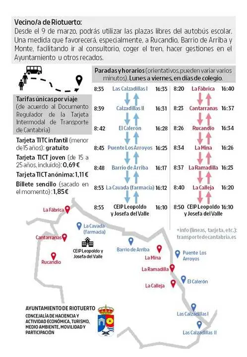 Los habitantes de Riotuerto pueden usar desde este lunes las plazas libres del transporte escolar que habitualmente llega al colegio público Leopoldo y Josefa del Valle, en La Cavada, para desplazarse por el municipio.