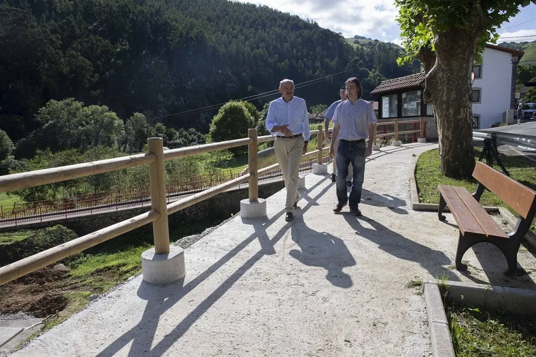 El consejero de Obras Públicas y Vivienda, José María Mazón, acompañado por el alcalde de Miera, Tarsicio Gómez, ha inaugurado este miércoles el paseo que su departamento ha realizado en Mirones para comunicar el núcleo urbano con la parada de autobús y con el futuro centro de salud.