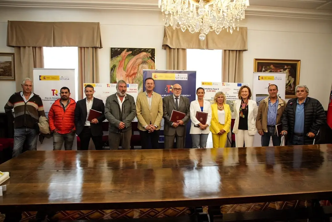 La firma de los convenios, entre el presidente de SEIASA, Francisco Rodríguez Mulero, y los representantes de las comunidades de regantes de Villamoñico-Revelillas y Ruijas-Ebro, Roberto Fernández y Heraclio Gómez, respectivamente, ha estado presidida por la delegada del Gobierno en Cantabria, Ainoa Quiñones; y también ha asistido el consejero en funciones de Agricultura, Ganadería, Pesca y Alimentación del Gobierno de Cantabria, Guillermo Blanco