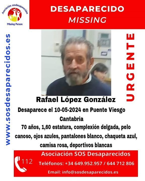 La descripción del hombre, aportada por SOS Desaparecidos, detalla que el hombre de 70 años mide 1,60, de complexión delgada, pelo canoso, ojos azules y que llevaba ua chaqueta azul, camisa rosa y deportivas blancas.
