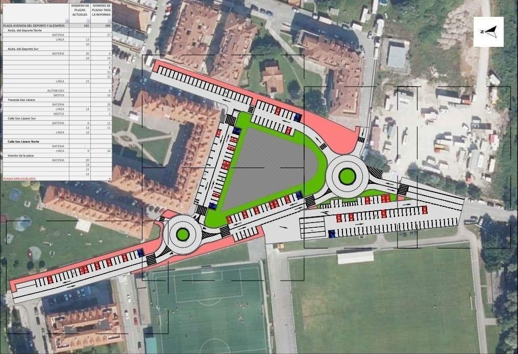 Según ha informado el Consistorio, esta nueva distribución contempla 27 plazas en batería en la avenida del deporte Norte y 89 en la sur, cuatro para autobuses y 10 para motos. En la Travesía San Lázaro se crearán 20 en batería, 11 en línea y dos para motos, y en la calle San Lázaro Sur habrá un total de 22 aparcamientos en batería. Por otro lado, en esta misma calle, pero en la zona Norte, se aumentarán las plazas en línea hasta las 24. Por último, en el interior de la plaza se eliminarán las plazas actuales.