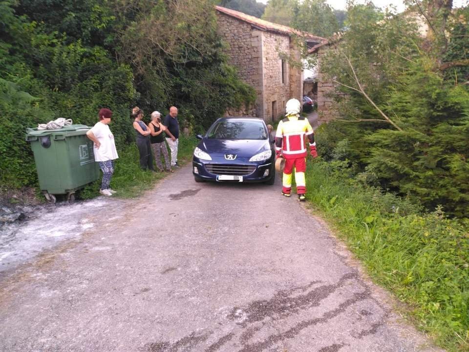 Bomberos del Gobierno de Cantabria del parque de la comarca pasiega han rescatado un vehículo que cayó por un terraplén en un barrio de Alceda, en Covera de Toranzo.