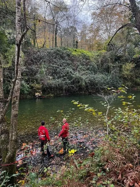 Aprovechando un vuelo del helicóptero, el equipo de rescate del Ejecutivo regional acudió a la zona, donde el rescatador cruzó el río a nado, asegurado con una línea de vida, y trasladó a la mujer y al perro a una zona segura en la otra orilla en dos tiempos.