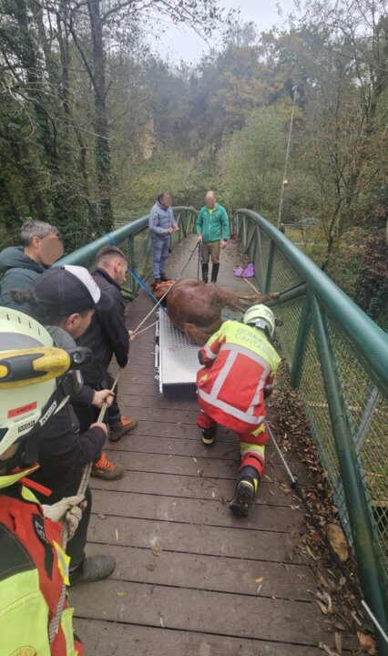 Los bomberos utilizaron cuerdas y un cabestrante para estabilizar a la yegua y liberar la extremidad con seguridad. Tras varios minutos de trabajo coordinado, lograron desencajar la pata sin que el animal sufriera lesiones importantes.