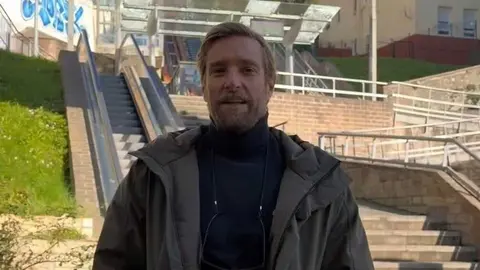 Una protesta contra el parque eólico del Escudo 'derriba' simbólicamente los futuros molinos
