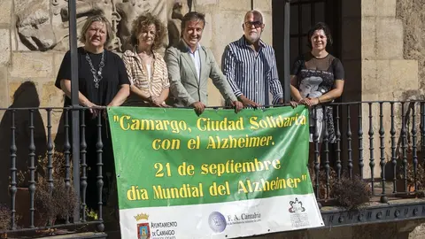 La fachada del Ayuntamiento de Camargo luce una pancarta solidaria con el alzheimer