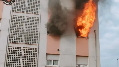 Losas de la fachada de un edificio de una urbanización de Sarón caen junto al acceso a la misma
