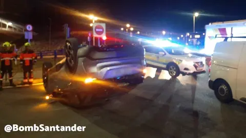 Coge la rotonda al revés, colisiona contra otro vehículo y acaba volcado en Torrelavega