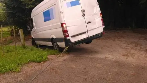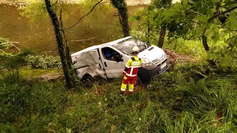 Bomberos del 112 liberan una furgoneta atascada contra un árbol en Villafufre